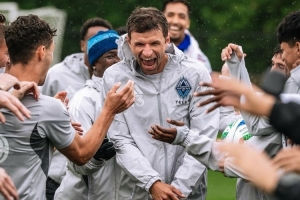 穆勒首次參加溫哥華白浪訓(xùn)練,隊(duì)友們組成“歡迎通道”,讓他從中間穿過,并不斷拍打這位德國足壇傳奇表示歡迎。