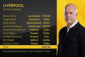 天空體育統(tǒng)計利物浦今夏轉入與轉出↓