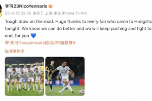 客場戰(zhàn)平,結(jié)果艱難。衷心感謝今晚來到杭州的每一位球迷。我們知道我們可以做得更好,我們將繼續(xù)拼搏,為你們戰(zhàn)斗到最后一刻。