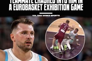 體育資訊08月17日訊 歐錦賽男籃熱身賽,斯洛文尼亞88-100不敵拉脫維亞,東契奇被隊(duì)友撞翻在地。