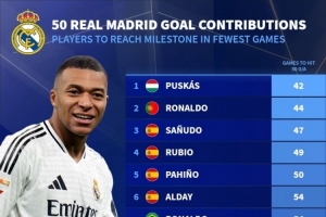 體育資訊8月21日訊 德國轉(zhuǎn)會市場統(tǒng)計(jì)了皇馬球員參與50粒進(jìn)球所需的場次,并列出最快參與50球榜單,普斯卡什42場居首,C羅44場次席,姆巴佩60場排名第13位。