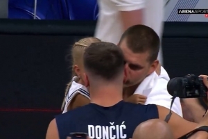 賽后約基奇與東契奇親密互動(dòng),前者親吻了后者的臉頰。