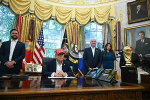 副總統(tǒng)JD-萬(wàn)斯(左一)、國(guó)際足聯(lián)主席詹尼-因凡蒂諾(右二)及國(guó)土安全部長(zhǎng)克里斯蒂-諾姆(右一)共同見(jiàn)證此次公告。
