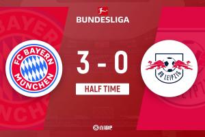 上半場(chǎng)傷停補(bǔ)時(shí)4分鐘,半場(chǎng)結(jié)束,拜仁暫3-0萊比錫。