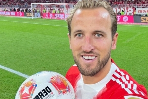 賽后,凱恩與本場比賽用球合影,拜仁在其官方社媒曬出這張照片,并配文寫道:“凱恩帽子戲法”。
