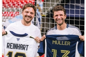 穆勒與效力于NFL佛羅里達美洲豹的加拿大冰球運動員萊因哈特見面,并互換球衣,溫哥華白浪社媒曬出兩人的合照,配文:“從冰場到球場,穆勒X萊因哈特,互換球衣?!?/p>
