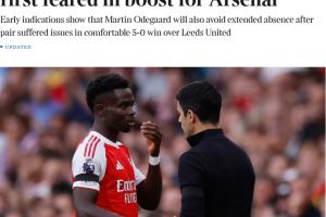 在昨日英超阿森納5-0擊敗利茲聯(lián)的比賽中,薩卡和厄德高雙雙因傷離場,引發(fā)眾多槍迷擔憂。主帥阿爾特塔在賽后曾表示,薩卡的傷情可能“不樂觀”。