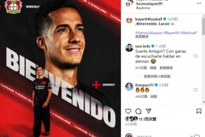 勒沃庫森官方社媒宣布免簽巴斯克斯,他的皇馬老隊友克羅斯留言道:“祝你好運,朋友,很期待聽到你說德語!”