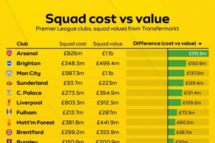 體育資訊08月27日訊 天空體育基于德轉(zhuǎn)數(shù)據(jù),盤點了英超各隊陣容的陣容成本,現(xiàn)在的價值,以及相比之下球隊陣容價值的變化。其中,阿森納陣容增值最多,曼聯(lián)虧損最多。以下是具體數(shù)據(jù),單位為鎊。