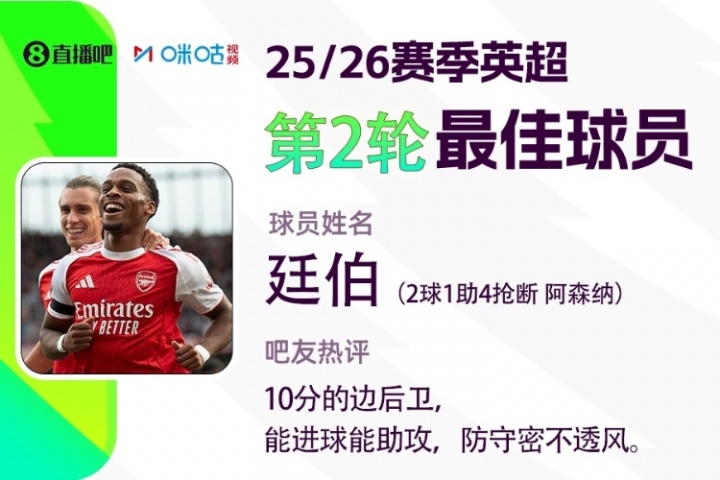 體育資訊8月27日訊 2025-2026賽季英超火熱進(jìn)行中,體育資訊和咪咕體育聯(lián)合發(fā)起每輪英超最佳球員評選活動!第二輪評選結(jié)果結(jié)出爐,阿森納后衛(wèi)廷伯2球1助4搶斷,攻守兼?zhèn)涞乃@得吧友近四萬吧友的投票支持,以較大優(yōu)勢當(dāng)選 【體育資訊X咪咕體育英超第2輪最佳球員】!