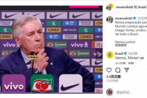 安切洛蒂社媒曬自己在新聞發(fā)布會中的照片,并寫道:“我們的世界杯備戰(zhàn)現(xiàn)在開始,我們希望以強(qiáng)大的實(shí)力、團(tuán)結(jié)的精神、肩負(fù)著整個巴西的夢想出征世界杯,讓我們一起加油!”