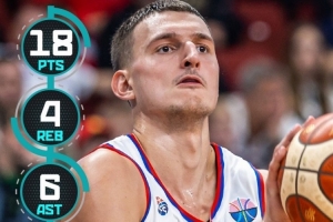 此役,塞爾維亞新星約維奇出戰(zhàn)三節(jié),登場15分51秒,投籃8中6,三分4中3,罰球3中3,得到18分4板6助1斷,正負值+36。
