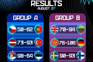 體育資訊8月28日訊 男籃歐錦賽首日六場(chǎng)比賽結(jié)束,全部賽果如下: