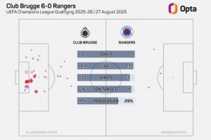 據(jù)OptaJohan的數(shù)據(jù)統(tǒng)計,布魯日6-0大勝流浪者,這是他們自2001年9月27日(7-1尼科西亞奧林匹亞科斯)以來在歐戰(zhàn)中最大比分的勝利。