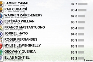 體育資訊8月28日訊 CIES(瑞士足球天文臺)評出今年非門將U20球員的表現(xiàn),亞馬爾成為評分最高的球員,庫巴西第二。