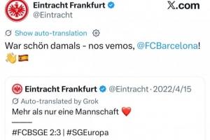 在抽簽出爐后,法蘭克福官推轉(zhuǎn)發(fā)了22年4月,球隊(duì)在歐聯(lián)杯1/4決賽次回合客場(chǎng)3-2擊敗巴薩晉級(jí)下一輪的賽后球隊(duì)合影慶祝勝利的社媒,并配文寫道:“那是一段美妙的經(jīng)歷,期待我們的再次相見,巴薩!”