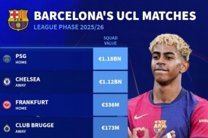 體育資訊8月29日訊 本賽季歐冠聯(lián)賽階段對(duì)陣抽簽結(jié)果出爐,德國轉(zhuǎn)會(huì)市場盤點(diǎn)了巴薩對(duì)手的身價(jià)。