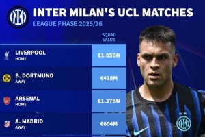 體育資訊8月29日訊 本賽季歐冠聯(lián)賽階段對陣抽簽結(jié)果出爐,德國轉(zhuǎn)會市場盤點了國米對手的身價。