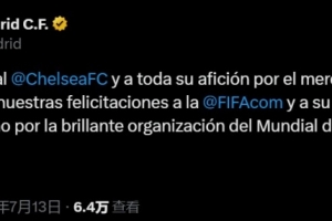 體育資訊7月14日訊 在切爾西3-0擊敗巴黎奪得世俱杯冠軍后,皇馬第一時(shí)間通過(guò)社交媒體表達(dá)了祝賀。