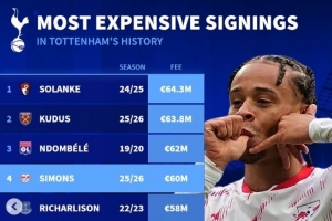 據(jù)德轉(zhuǎn)數(shù)據(jù)統(tǒng)計(jì),6000萬(wàn)歐簽下西蒙斯是熱刺隊(duì)史第四貴引援。