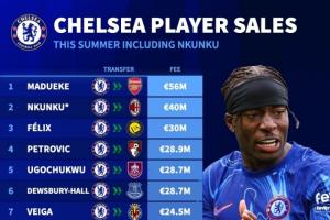 據(jù)德轉統(tǒng)計,切爾西今夏賣人總收入將達到3.165億歐元,冠絕全球,比賣人榜第二位的伯恩茅斯多了近8000萬歐元。