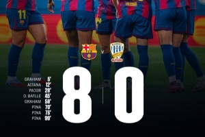 體育資訊8月31日訊 西甲女足首輪,巴薩女足8-0大勝升班馬阿爾哈馬,順利取得開門紅??藙诘蠇I-皮納上演帽子戲法,格雷厄姆-漢森梅開二度,此外艾塔娜、帕若爾和奧娜-巴特列也各有斬獲。