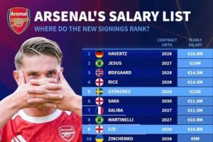 體育資訊09月01日訊 德轉(zhuǎn)列出了阿森納球員的年薪排行,哈弗茨以1690萬歐居首,今夏引進(jìn)的約克雷斯和埃澤進(jìn)入了球隊(duì)前十。