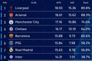 機(jī)構(gòu)預(yù)測聯(lián)賽階段(排名、球隊(duì)、預(yù)期積分、預(yù)期凈勝球、前八概率):