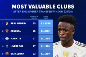 夏窗結(jié)束后俱樂(lè)部身價(jià)排名: