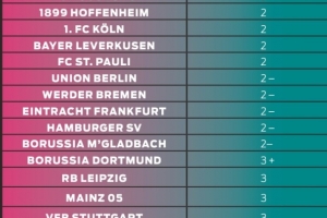 2分:奧格斯堡、霍芬海姆、科隆、勒沃庫森、圣保利