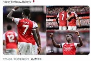 阿森納官方社媒曬出薩卡的照片,配文:“我們的7號,生日快樂,布卡約(薩卡)!”