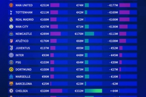 體育資訊9月5日訊 今夏轉(zhuǎn)會市場格外火熱,《轉(zhuǎn)會市場》也統(tǒng)計了20支歐洲球隊的支出、收入及盈虧情況。