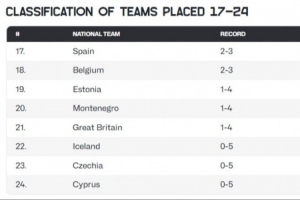 本屆賽事17到24名的排名也最終確定,分別是西班牙、比利時(shí)、愛沙尼亞、黑山、英國、冰島、捷克和塞浦路斯。