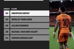 數(shù)據(jù)統(tǒng)計顯示,自1978年世界杯以來,德佩是荷蘭隊助攻數(shù)并列最多的球員。