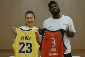 詹姆斯與李夢(mèng)親切交流,互贈(zèng)禮物。李夢(mèng)送給詹姆斯一個(gè)成都的吉祥物“花花”玩偶,詹姆斯回贈(zèng)李夢(mèng)簽名球衣和球鞋,兩人還互換球衣并合影。