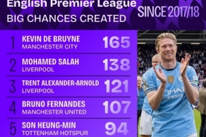 體育資訊9月7日訊 數據機構squakwa統(tǒng)計了17-18賽季以來的英超創(chuàng)造重大機會情況,德布勞內力壓薩拉赫居首。