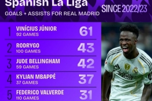 體育資訊9月7日訊 squakwa統(tǒng)計了22-23賽季以來皇馬球員在西甲聯(lián)賽的直接參與進球(進球+助攻)情況,維尼修斯居首。