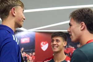 西班牙隊官方社媒曬出視頻,西班牙后衛(wèi)赫伊森賽前與土耳其國腳居勒爾、伊爾迪茲見面寒暄。