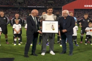 體育資訊9月8日訊 德國隊(duì)在本輪世預(yù)賽主場迎戰(zhàn)北愛爾蘭,主隊(duì)賽前為退役的老將胡梅爾斯舉辦了致敬儀式。