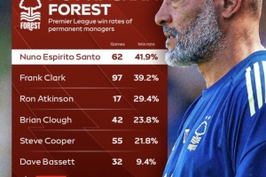 體育資訊9月9日訊 諾丁漢森林官宣努諾下課,根據(jù)數(shù)據(jù)統(tǒng)計(jì)努諾是森林隊(duì)史英超勝率最高的主帥。