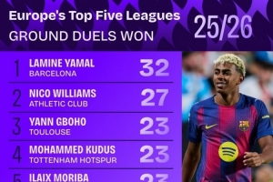 體育資訊9月12日訊 Squawka統(tǒng)計(jì)了本賽季球員在五大聯(lián)賽的地面對(duì)抗成功次數(shù),并列出榜單。