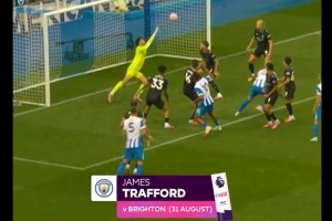 英超第3輪,曼城客戰(zhàn)布萊頓,此役第88分鐘,布萊頓右側(cè)角球機(jī)會(huì),小禁區(qū)線(xiàn)范赫克的攻門(mén)被特拉福德?lián)醭觥?/p>