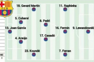 西班牙媒體《阿斯報(bào)》預(yù)測(cè)了巴薩此役的首發(fā)陣容,萊萬(wàn)、費(fèi)蘭-托雷斯、拉菲尼亞組成鋒線三叉戟,卡薩多則在中場(chǎng)首發(fā)。