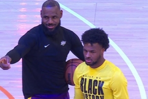 只見(jiàn)詹姆斯從場(chǎng)邊走向正在練習(xí)投籃的布朗尼,并指向場(chǎng)邊:“布朗尼,你媽叫你過(guò)去!”布朗尼則立即停止訓(xùn)練,掃視場(chǎng)下媽媽的位置。