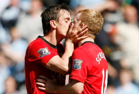 2010年4月,斯科爾斯在曼市德比最后時(shí)刻打入制勝球,幫助曼聯(lián)1-0取勝。進(jìn)球后,他和內(nèi)維爾在場上親吻,震驚全場。
