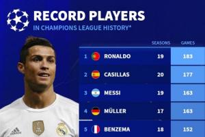 體育資訊09月16日訊 今夜,新賽季歐冠就將打響。德轉(zhuǎn)在賽前列出了歐冠歷史出場(chǎng)榜,C羅以183場(chǎng)位列榜首,卡西、梅西分列二三。