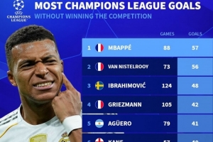 體育資訊9月17日訊 德國轉(zhuǎn)會市場統(tǒng)計了沒有贏得歐冠球員的歐冠進球數(shù)量,并列出榜單,姆巴佩57球居首。