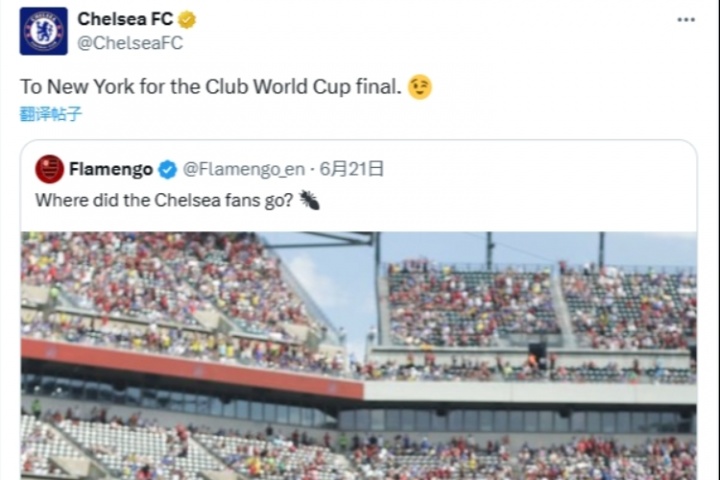 弗拉門戈小組賽3-戰(zhàn)勝切爾西,當(dāng)時(shí)他們球隊(duì)社媒曬照嘲諷:“切爾西球迷們要去哪?”切爾西今天也在社媒轉(zhuǎn)發(fā)回應(yīng):“去紐約參加世俱杯決賽???!?/p>