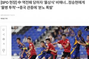“被水瓶擊中的鄭升炫憤怒地向中國球迷提出抗議,正在熱身的李清龍上前制止避免沖突升級,但這一幕足以展現(xiàn)中國球迷的不文明。”