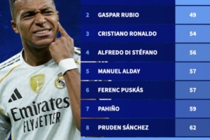 姆巴佩打進(jìn)50球用了64場(chǎng)比賽,在皇馬隊(duì)史排名第9。